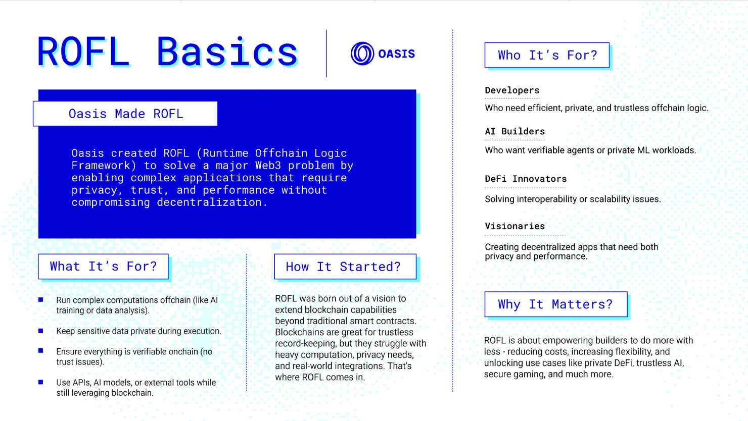 目前在这个方向上集成最领先的项目,是 Oasis Protocol 的 ROFL(Runtime Offchain Logic)。Oasis Protocol 是一条主打隐私保护的 Layer1,而 ROFL 是 Oasis 自己开发的一个计算框架,全称 Runtime Offchain Logic,直译就是"链外运行逻辑"--它解决的问题很具体:怎么让链下发生的计算,被链上信任。ROFL 模块上线后,定位是面向 AI 应用的"Trustless AWS":开发者可以在链下的可信执行环境(TEE)中运行 Agent 代码,计算结果经密码学证明后写回链上,整个过程不依赖任何中心化运营方的信誉背书。