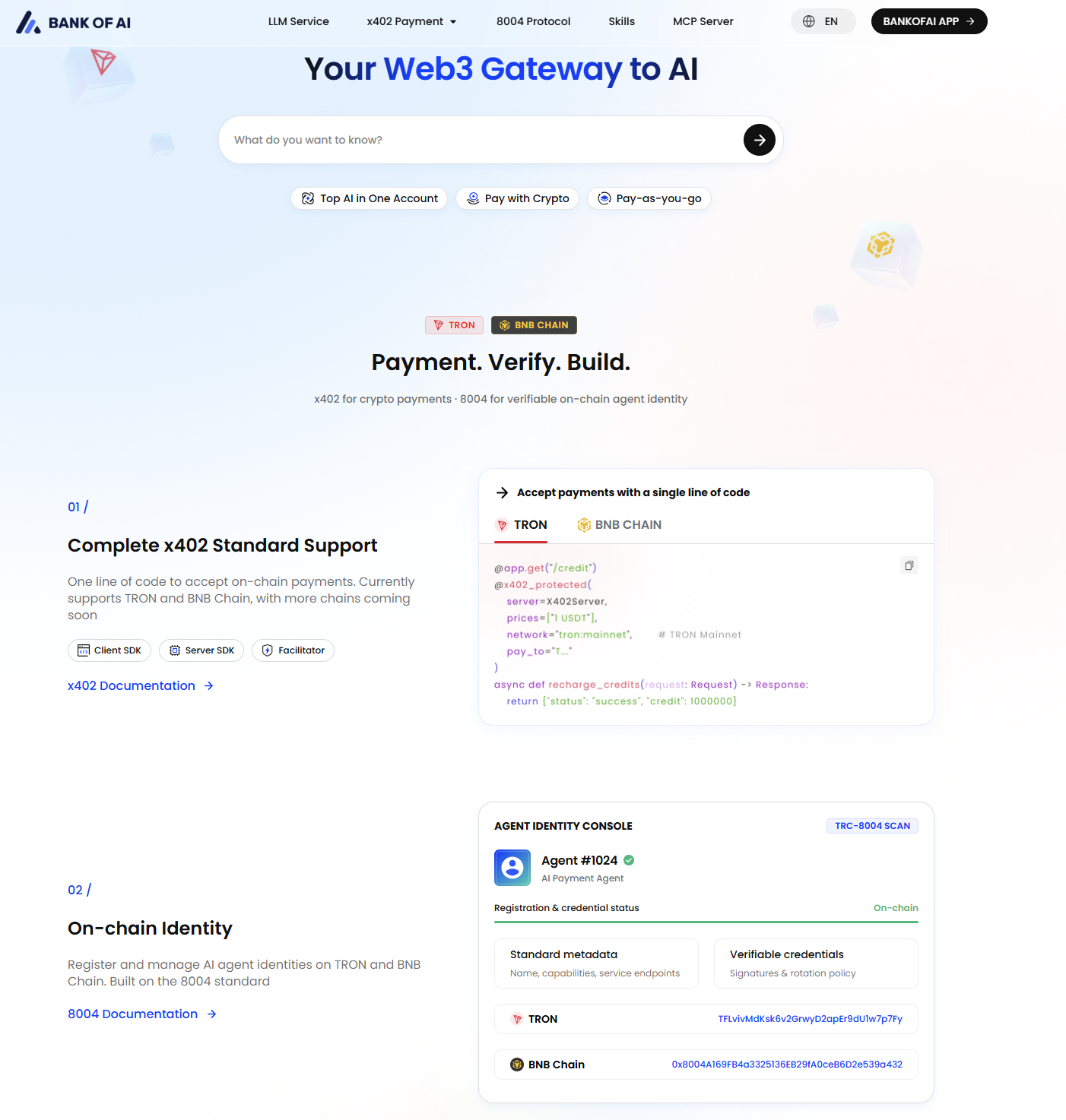 支付层是 Agent 从信息处理工具跃迁为真正经济主体的关键一环。前文已经阐述 x402 协议的技术原理与治理架构,本节聚焦其在 TRON 生态中的典型落地案例--Bank of AI(https://bankofai.io/),它是 AI Agent 时代基础经济设施 白B.AI(https://b.ai/)产品的重要组成模块。这一案例之所以具有代表性,在于它并未停留在协议层的抽象讨论,而是首次将 x402、ERC-8004、MCP Server、Skills 以及 OpenClaw 扩展五大核心组件打包成完整的 Agent 经济操作系统,使 Agent 在真实链上环境中具备了端到端的业务执行能力。