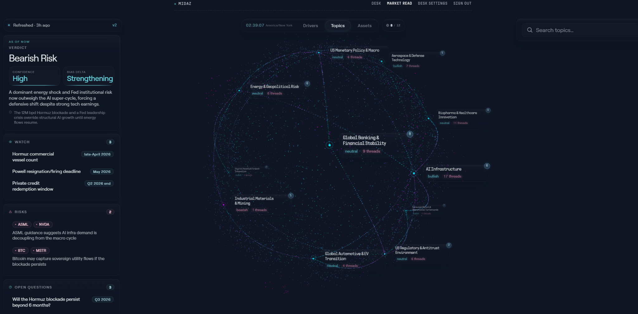 Midaz(midaz.xyz)是当前这一方向上最具代表性的实践。其核心理念可以用一句话概括:Built for Agents, Visualized for Humans。作为 2025 年币安黑客松的获奖队伍,Midaz的核心团队成员来自 Millennium、Citadel等华尔街顶级量化基金,将市场信息重构为三个结构化层次:Assets 层对应具体交易标的,Topics 层将围绕资产的事件与信号聚合为带有方向性判断的市场主题,Drivers 层则进一步抽象出驱动这些主题演变的因果力量--例如美国滞胀与消费信贷周期断裂、AI 基础设施扩张与定制芯片采用等。