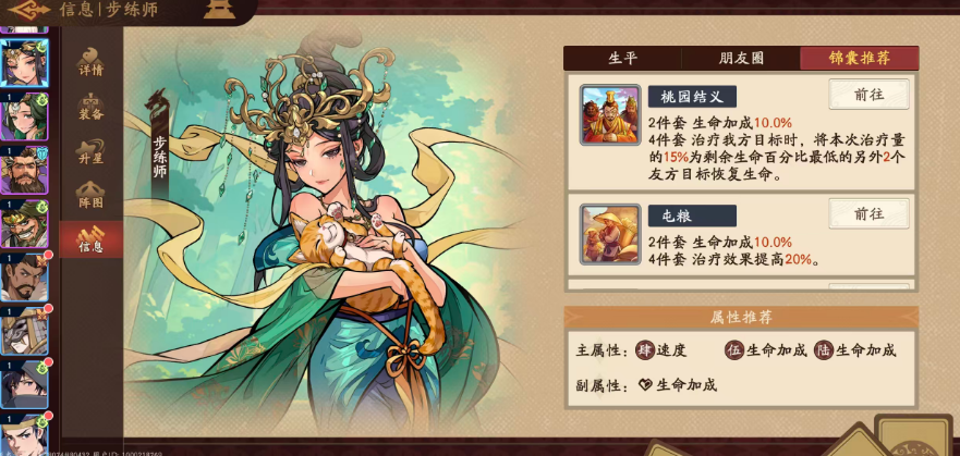 装备养成策略需聚焦功能性优先级:速度属性为第一核心,直接影响技能释放顺序与治疗响应时效;其次为生命值成长,保障生存与治疗基数;副属性可通过锦囊进一步补充生命加成。需注意,步练师并非传统坦克,其强度不依赖高额血量堆叠,而在于治疗效率、转嫁精度与增益覆盖率的协同优化。因此,速度达标后的生命提升,应以“支撑治疗上限”为基准,而非盲目堆砌防御数值。