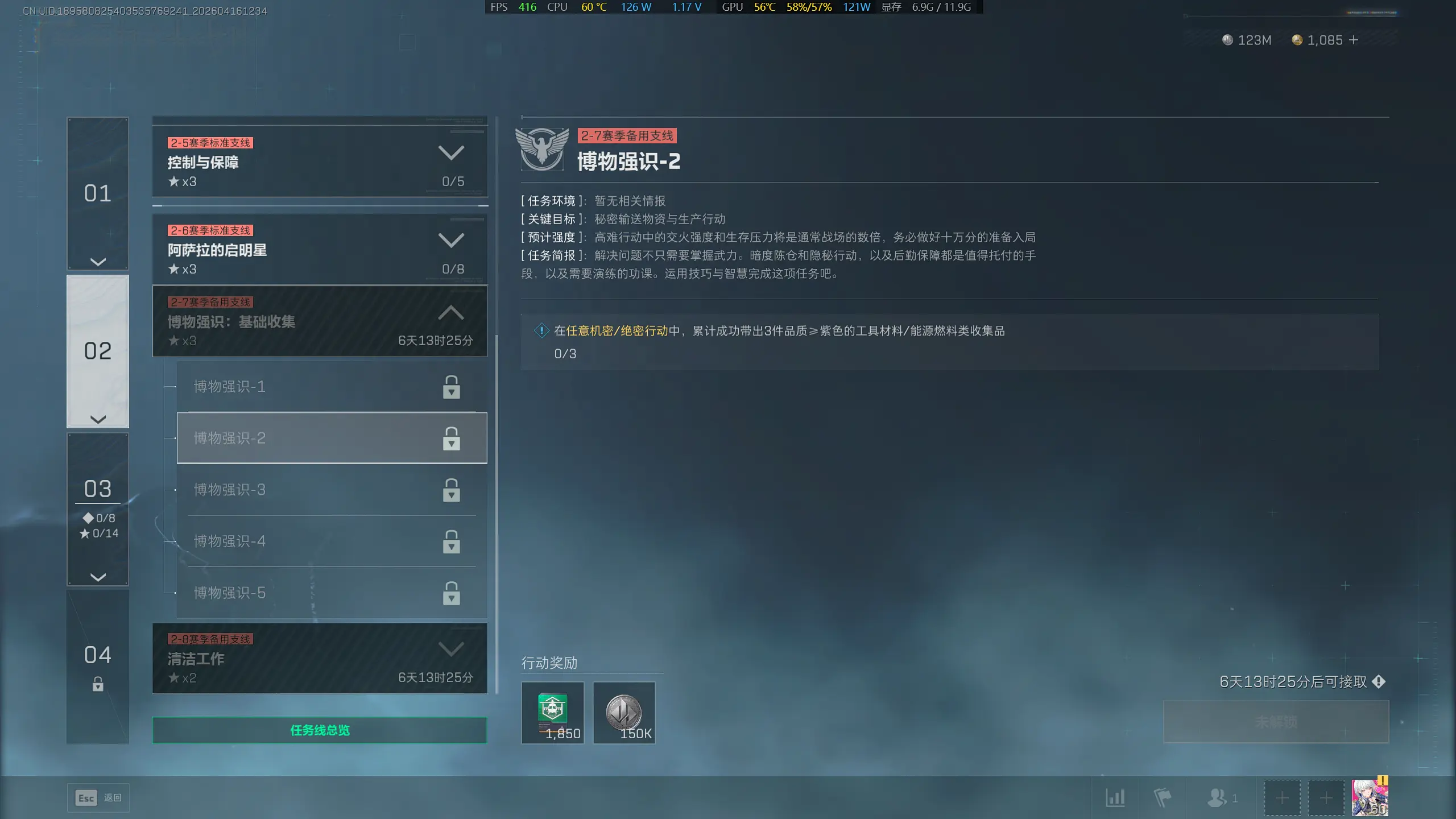 在任意机密/绝密行动中,累计带出3件品质≥紫色的工具材料/能源燃料类收集品