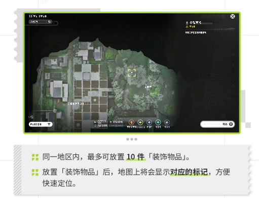 系统设有单区域容量上限:每个地图子区域最多容纳10件装饰物品。超出数量限制时将无法继续放置,建议提前规划布局重点。所有已放置装饰均会在地图上生成专属定位标记,便于后续快速识别与管理。