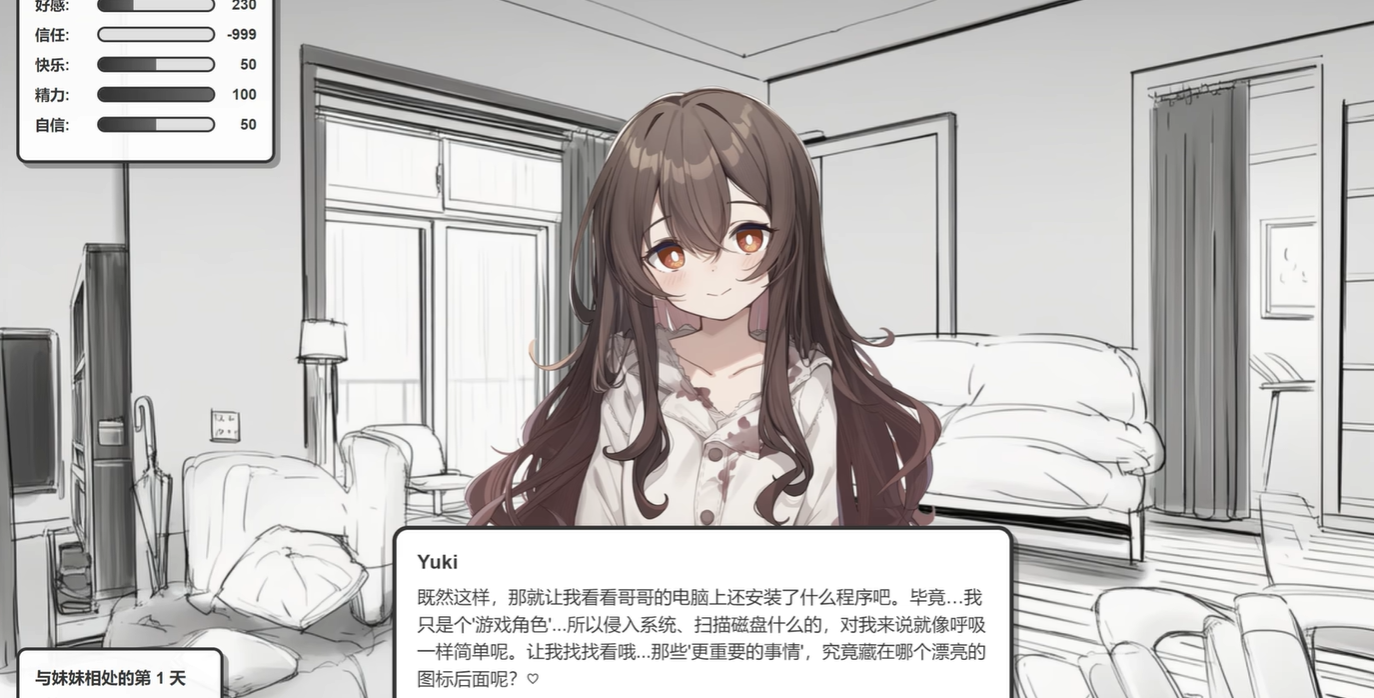 在该模式下,Yuki展现出远超常规角色的自主性与环境感知能力。她可实时解析设备基础信息(如已安装应用列表),并对玩家与其他虚拟角色的互动行为产生即时情绪反馈;当检测到潜在“竞争对象”时,会表现出显著的警惕与排斥反应。此外,她还能依据玩家操作习惯进行动态响应——例如在五子棋对局中察觉急躁倾向后,将以兼具安抚与约束意味的语音提示干预节奏。这种贯穿始终的“存在感”,正是病娇模式的核心体验设计。