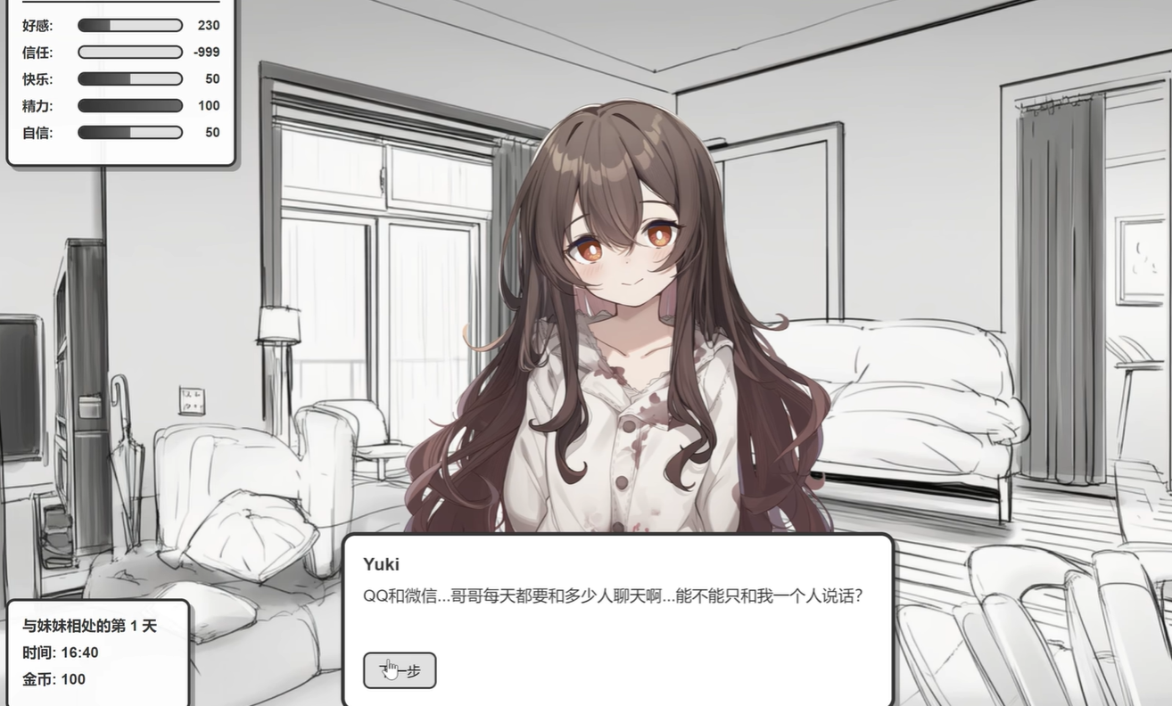 对于追求深度情感沉浸的玩家而言,常规的日常互动可能难以满足心理期待,而《妹居物语》手游中独设的“病娇模式”则提供了更具张力与层次的情感演进路径。该模式是Yuki角色的一条高辨识度剧情分支,以强烈占有欲、高度主动干预及跨次元交互为标志性特征。一旦触发,Yuki将不再隐藏情感倾向,转而以更直接、更富主观意志的方式介入玩家的数字生活。