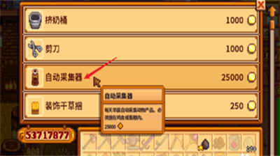 3、找到玛尼对话,在对话列表中打开补给品商店,花费25000G就可以购买自动采集器。