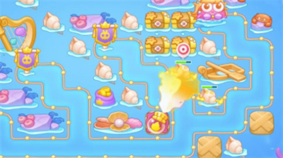 2、在右边继续搭建火罐炮台,攻击上方四个宝箱获得五芒星炮台,对怪物进行攻击。