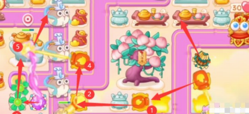 3、右侧的火瓶将右侧道具开完之后向中间开图,然后把中间的道具开完放置火瓶,左侧开出来的格子放置风扇。