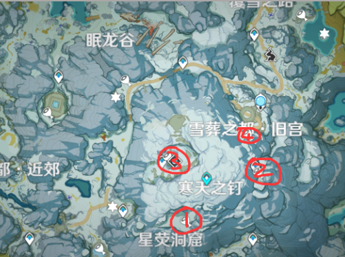 3号点可能会看不清,标识一下(在圣遗物副本门口)。1号点建议从寒天之钉山顶飞下来(如果地图还未走完,建议做主线的时候带一个口袋锚点,放在山顶,方便在雪山的探险)。2号点可以从风神像直接到,前提是你已经收集齐三个宝匣,才能打开大门(这里面也有宝箱)。4号点即在最终宝物门口,在风神像的下一层,这个石碑最后点亮。石碑全部点亮开启大门的机关才会解除封印。这里记得最后的洞窟里有四盏篝火点亮,可以获取新武器。