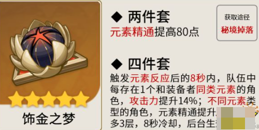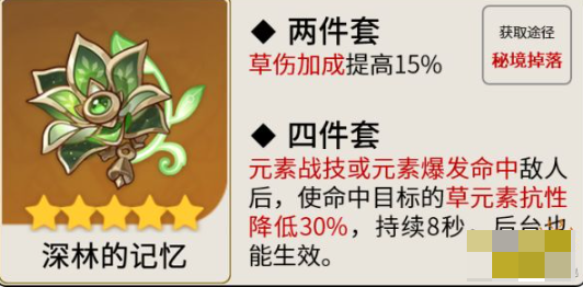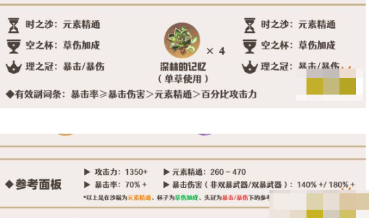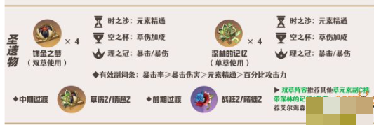 圣遗物在保证队伍里有深林套的情况下可选4饰金。或者副词条好的2精通+2精通、2精通+2草伤散搭。(队伍里实在没人带深林套就自己带,但是更推荐辅助型的队友去带深林套)