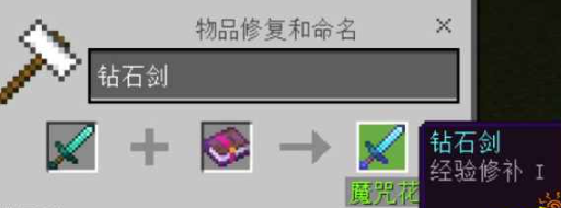 1、首先需要一本经验修补附魔书、铁砧以及一件装备,这个装备可以是工具,武器或盔甲,打开铁砧的合成界面,如图所示进行放置,即可获得具有经验修补附魔效果的装备。