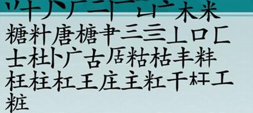 糖、籵(fán)、唐、榶(táng)、一、二、三、亖、丄、口、匚、凵、十、士、木、米、杜、卜、厂、广、古、䊀(hú)、枯、丰