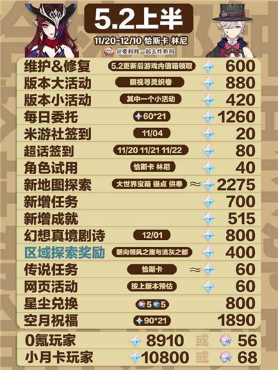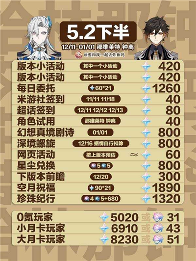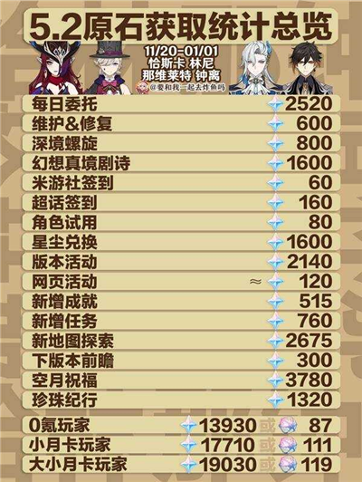 原神5.2版本原石多少个 原神5.2版本原石获取总数一览