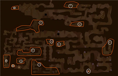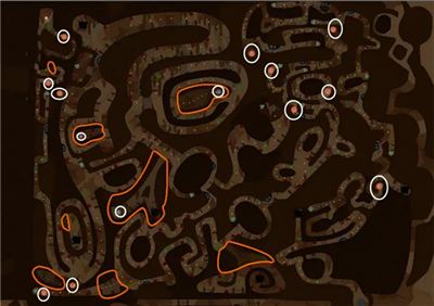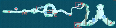 洞穴②的地图虽然看去更为庞大复杂,但实际上是比较单向的路线,没有很多的岔路,因此实际跑起来难度不大,但注意不要遗漏了隐藏区域(一共有8个,见红框),待收集光子共有14个(白圈)。