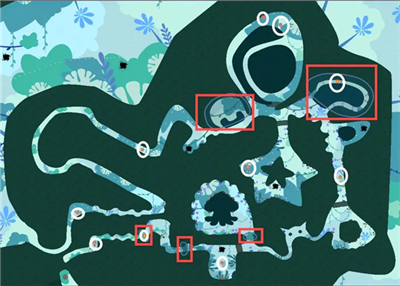 森林①是教学关卡,相对比较简单的线性路线,一共有6个隐藏区域(红框),10个待收集光子(红圈),全收集难度不大。