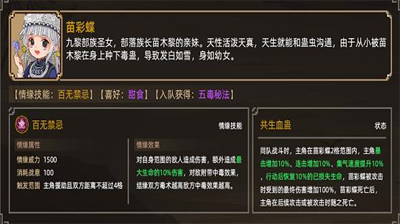 2、得知苗彩蝶3天后返回九黎部落,在此直接将好感拉满(若主角身上有丁家血蛊,与苗彩蝶好感达到50以上可以解蛊,解蛊后与苗彩蝶好感降低40);
