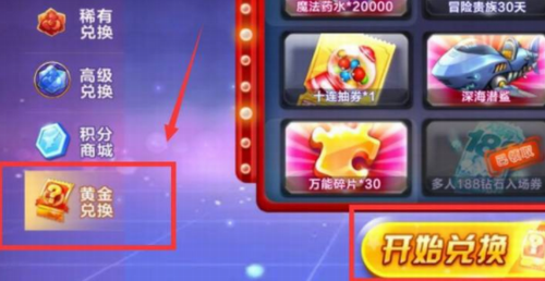 3、然后我们点击左手边的黄金兑换。点击开始兑换,即可进行黄金奖池的抽奖活动。