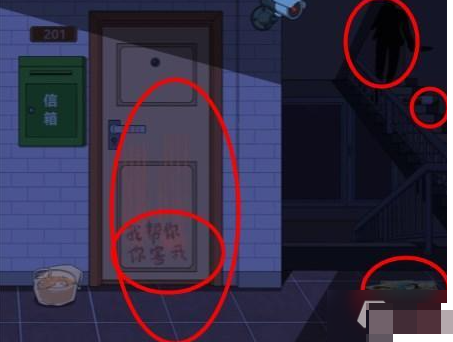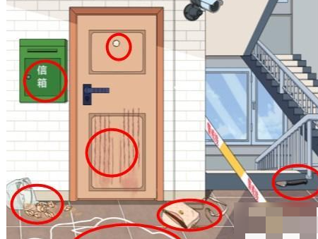 1、进击的汉字案发现场需要还原案件的真相,首先在第一个场景,点击信箱、断裂的刀、打开的包、打翻的馄饨、门上的划痕、地上的白线、黏住的猫眼