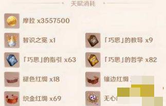 「巧思」的哲学*16、织金红绸*12、无心的渊镜*2、智识之冕*1、摩拉*700000