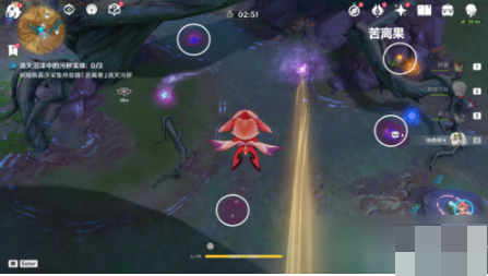 (3) 一旦您接近荆棘枝条,您会发现一些淤泥阻碍了您的前进。此时,您需要采集附近的苦离果,然后使用q技能将其投掷到淤泥上方以清除淤泥。然而,淤泥会不停地移动并随时翻涌,您需要等待淤泥冒泡泡的时候再清除它。