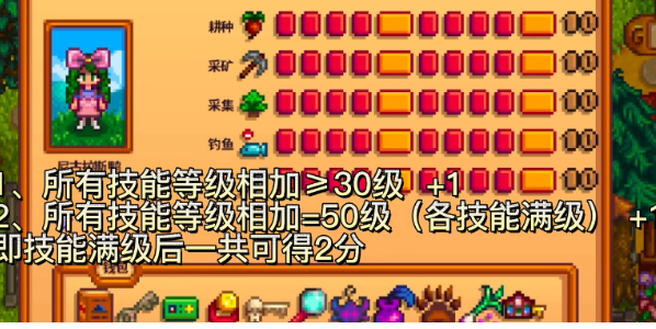当我们所有技能大于等于30级后即可获得1分,在所有技能满级也就是50级后还可以获得1分,也就是总共可以获得2分。