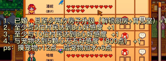 我们结婚了并且房子升级过两次,可以获得1分,与五位村民达到八颗心的好感度可以加1分,与十位村民达到八颗心的好感度可以加1分,与宠物达到五心好感度也可以获得1分。