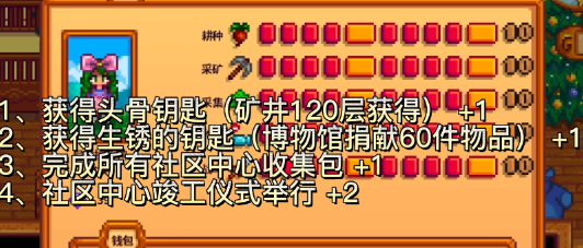 获得头骨钥匙可以加1分,获得生锈钥匙也可以加1分,把社区中心所有收集包完成可以加1分,社区中心的竣工仪式举行可以获得2分。以上就是小编为大家带来的星露谷物语爷爷的评分标准是什么的图文攻略,其实只是按照小伙伴们平常在游戏中的收集与探索来给分,很容易就能到12分,还没拿到足够分数的小伙伴快去努力吧!