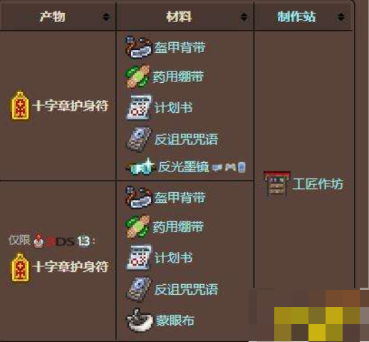 1、十字章护身符由1个盔甲背带,1个药用绷带,1个计划书,1个反诅咒咒语和1个反光墨镜/蒙眼布,在工匠作坊合成制作;