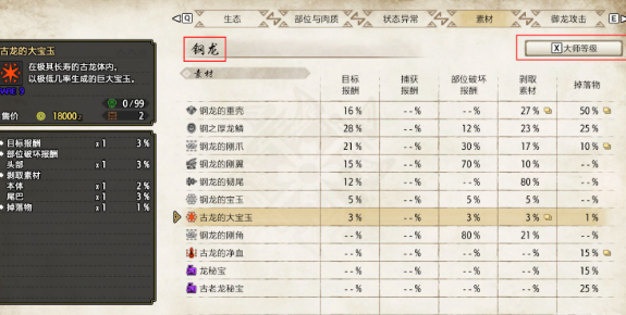大师级钢龙,古龙的大宝玉获取概率,目标报酬3%,头部破坏3%,剥取本体2%,剥取尾巴3%,掉落物1%