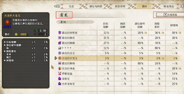 大师级霞龙,古龙的大宝玉获取概率,目标报酬3%,头部破坏3%,剥取本体2%,剥取尾巴3%,掉落物1%