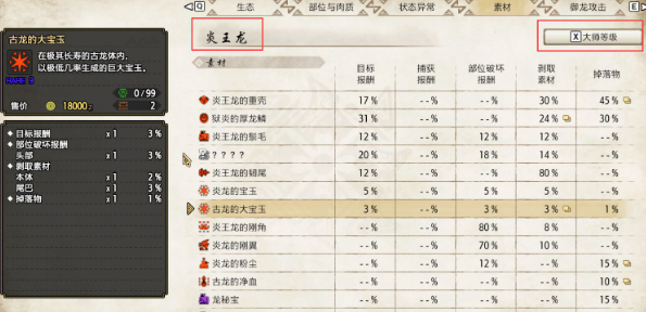 大师级炎王龙,概率和钢龙、霞龙一样,也是目标报酬3%,头部破坏3%,剥取本体2%,剥取尾巴3%,掉落物1%