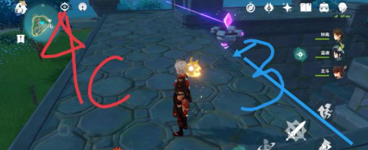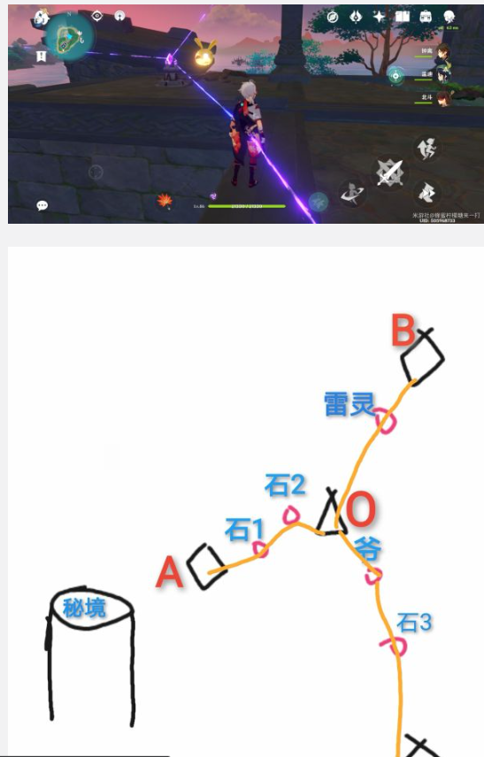首先从地下捞出三个继电石一个雷灵(需要做遗迹退水的前置解谜,此处不做赘述,各位旅行者可以自行查找相关攻略),注意不要越过最靠近秘境的一个放电石头(A)的位置,否则继电石会消失回到原位