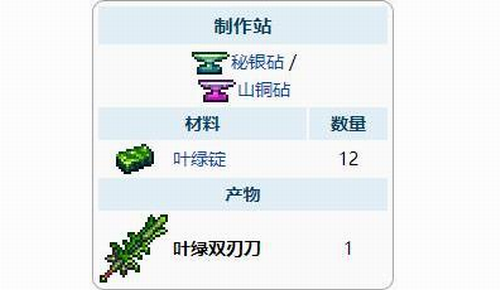 合成获得:玩家可以在秘银砧、山铜砧附近,使用12个叶绿锭,获得1个叶绿双刃刀。