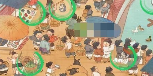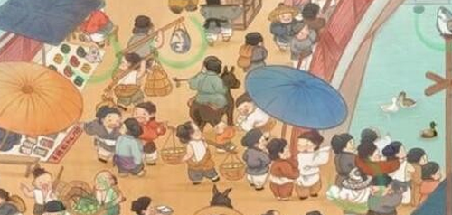 3、中间路上有人挑着鲨蛋,旁边是鲨缺,下方左边有一筐鲨瓜,底部有人戴着鲨帽
