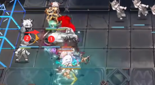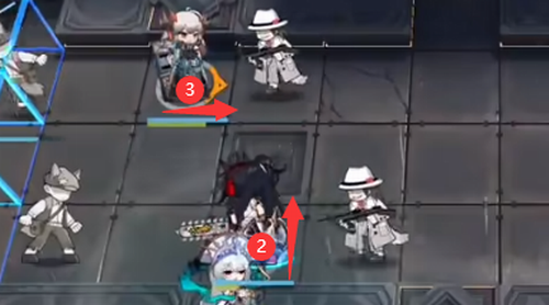 如下图所示位置部署浊心斯卡蒂,随后部署煌(向上)→ 塞雷娅