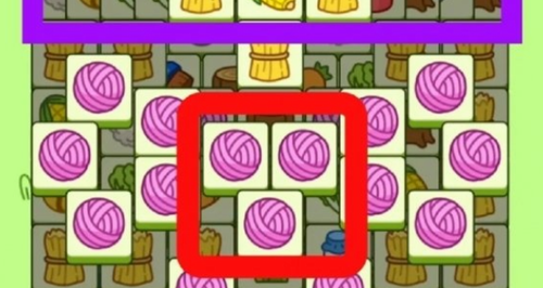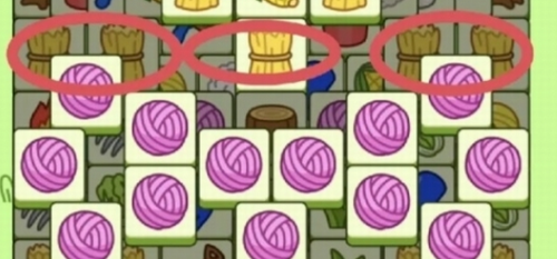 1.开局先把下图红圈中的7张牌拿掉,然后消除掉表面所有的毛线球(包括下面蓝圈里的四个)