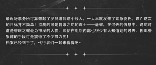 作为碧眼之蛇的“蛇脑”,诡蛇的出发点从来都是组织的利益,在她的世界里,没有所谓的好坏之分,只有利益的多少。千万小心,任何情况下都不要与碧眼之蛇产生利益冲突,否则她那些比坏人更毒辣的手段一定会让你终生难忘。