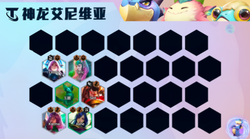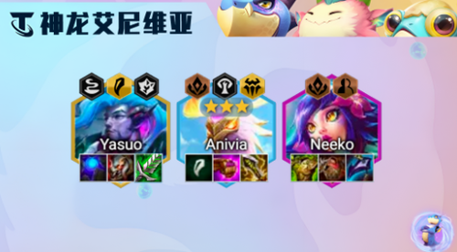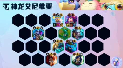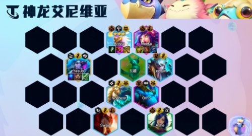 3阶段:3-2升6人口找到6神龙3玉龙羁绊,直接将艾尼维亚顶在前排。尽可能找到2星艾尼维亚,保证在前期的坦度,没有3半神献祭之前艾尼维亚的坦度会差一些。