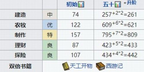 初始属性:建造74,农牧122,制作157,理财87,探险107。
