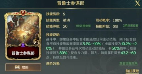 S级技能:【普鲁士参谋部】、【铁浮屠阵】、【天主之盾】等直接附加属性或者增加主动技能概率的技能。