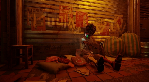 转身往回走,餐厅对面的路中央有个蓝色的全息投影,进入投影后边的路,走楼梯下来后右拐进入小巷,跳到右侧的平台上,再跳到墙边的空调箱上,一直向前走,走到小巷尽头后再沿着空调箱往上跳,在橙色管道旁有个小窗户,进入后会发现一个死去的机器人,互动后可以拿到警察徽章。