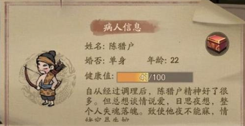 病情:自从经过调理之后,陈猎户精神好了很多。陈但总想谈情说爱、日思夜想,整个人失魂落魄,致使他夜不能寐,情绪容易失控。