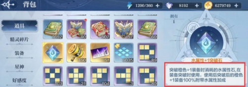 3、点击强化满的装备,然后点击突破,进入装备突破界面,放入三件同样的橙装,如果装备该装备的精灵为水属性,可以投入相关的水系突破石,为装备添加水属性,最后点击突破即可。
