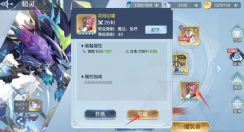 2、当精灵的橙色装备强华到五级后,就可以使用突破石。