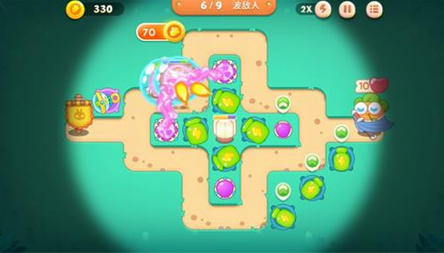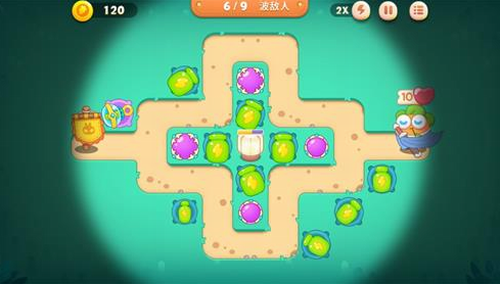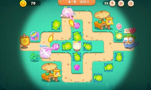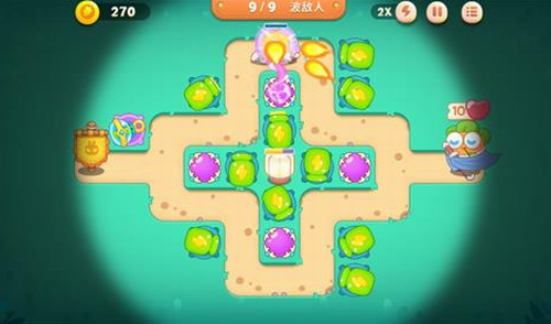 第一关开图右下角三个瓶子炮,其中一个两级,左上角一个两级瓶子炮,清中间的草,清完草建两个瓶子炮亮灯【如下图】: