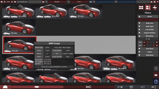 设计您会想要拥有的汽车。从各种底盘类型和材料、发动机布置和传动系统设置、变速箱、悬架、制动器、轮胎中进行选择,并以完全可 定制的车身类型,外观和样式完成设计。
