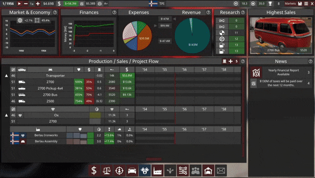 你的汽车公司将从1946年开始,一直持续到2020年,你的主要目标是从零开始建立一个成功的、享誉世界的汽车公司。如果管理得当,所有类型的汽车都可以取得成功;多年来建立正确的形象是关键。玩家的任务是设计引擎和汽车,管理工厂,生产,研发以及广告推广。在游戏中,时间随着玩家的选择进行,并在事件发生时暂停。