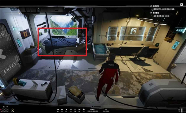 打开地图来到队长室,直接在床上睡到第二天,然后从气阀舱回到星球地表。