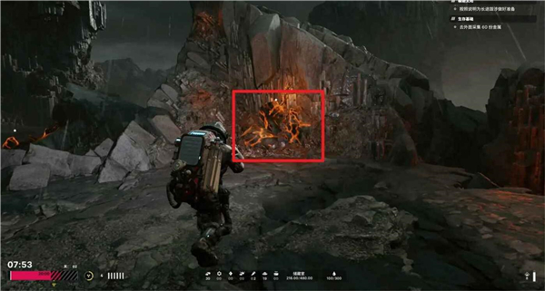 周围走一段,有很多散发橙色光芒的石头,这就是金属,靠近按下互动键采集。