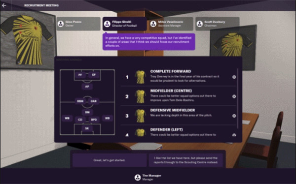 2、和你的教练团队一起分析球队阵容的强项与深度,再进入转会市场寻找补强选项。没准你的青训体系中就有一位正在期待进入一线队机会的未来巨星……