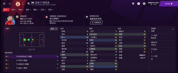 18岁的中后卫,督项属性都非常不错,但身体属性较弱,潜力很高值得培养。